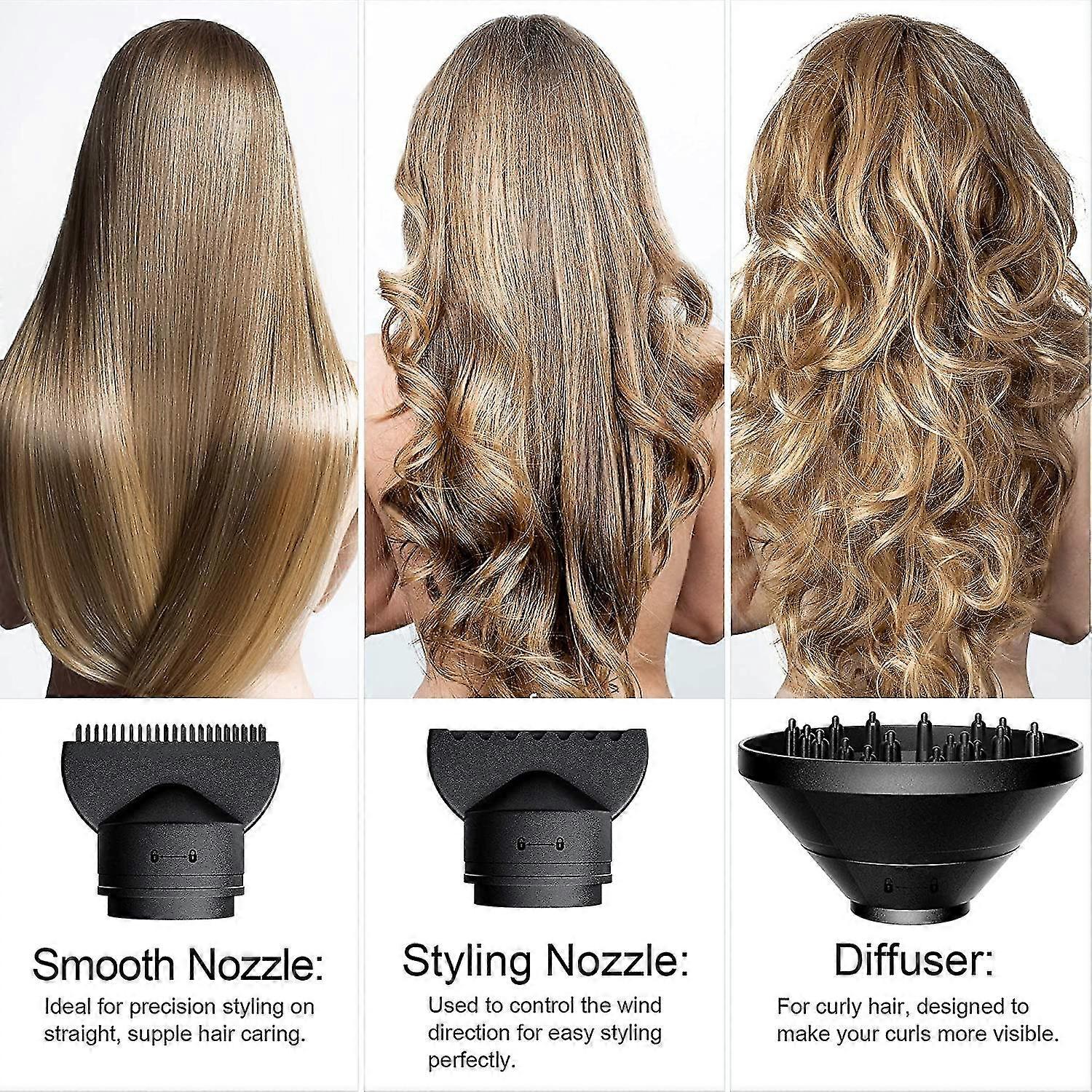 2000W Ionic Hair Dryer2000W AC motor, long life, low consumption. Produces stable high-velocity airflow for the fastest drying. Quickly and more easily and create charming hairstyles.Negative Ionic TechnologyNegative ions moisturize hair, reduce static and frizz, seal the cuticle, smooth hair, eliminate bifurcation, reduce protein damage, lock in humidity and increase hair shine. hair. Effectively care for hair for a long time.Overheat Protection2000W professional hair dryer with airflow collection technology increases the wind speed of the hair dryer and uses a U-shaped heating wire to distribute heat evenly. Maintains temperature to effectively prevent heat damage.3 Types of Removable Air NozzlesComes with 3 different types accessories, 2 nozzles and 1 diffuser. The straightening nozzle is used to dry the hair while straightening the hair. The styling nozzle is used to control the direction of the wind and facilitate styling. diffused nozzle make curls more obvious.3 Temperature ModesVariable speed temperature control, for optimal control and versatility of your hair. Suitable for different hairstyles and drying times as well as heating and cooling for different hair types. You can adjust the temperature and air speed according to your hairstyle.